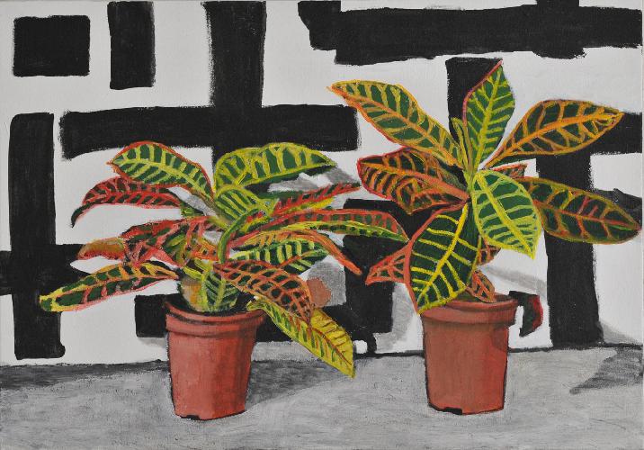 two plants with black-and-white paintingacrylic on canvas70x100 cm