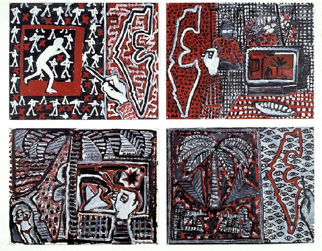 tv and palms (part of studio green line)acrylic on paper(70x100)x4 cm.