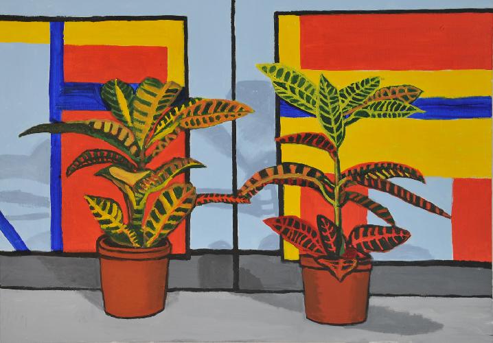 two plants with red yellow and blueacrylic on canvas70x100 cm.