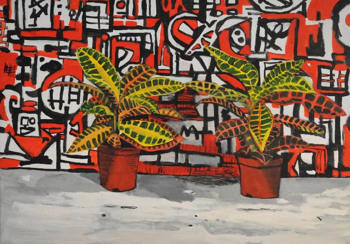 two plants with red painting