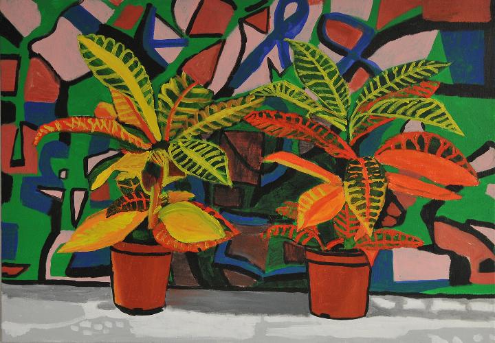 two plants with green and pink painting
