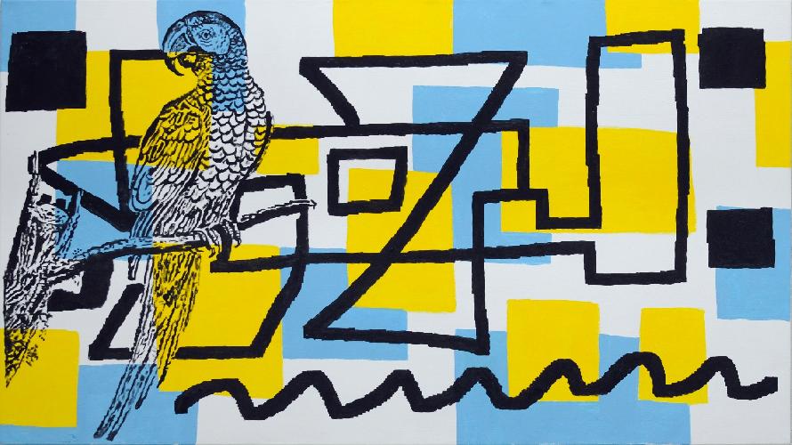 blue and yellow parrotacrylic on canvas90x160 cm