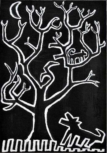 treed cat with crescent moonacrylic on canvas100x70 cm